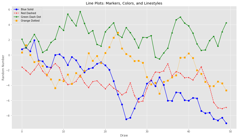 ax1.set_title('Line Plots: Markers, Colors, and Linestyles')