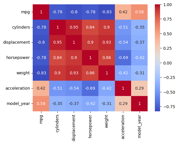 correlation_matrix = data.corr(numeric_only=True)correlation_matrix| mpg | cylinders | displacement | horsepower | weight | acceleration | model_year | |