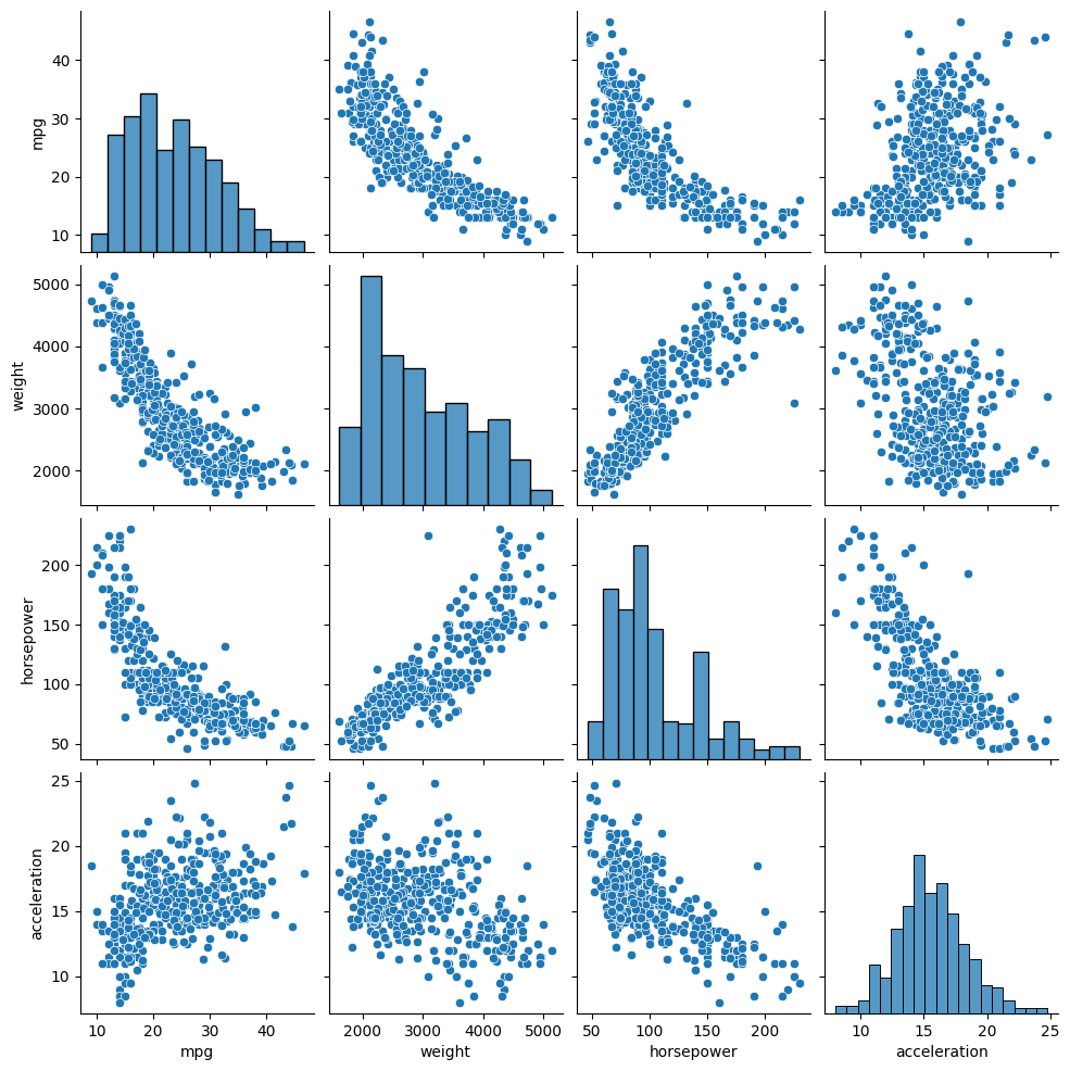mpg weight horsepower acceleration